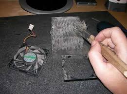 El cooler lo limpiamos con una brocha, y rematamos con un trapo (pedazo de tela), algo húmedo y con algo de jabón, hasta que quede limpio, podemos retirar la etiqueta, quitar el sostén de plástico con mucho cuidado, ya que lo volveremos a colocar, extraer el ventilador, limpiar toda la parte interior, al tubo de metal se le debe quitar todos los residuos. Con el dedo le podemos aplicar un poco de aceite o vaselina, es mejor la vaselina porque no se seca, pero solo para que se lubrique, no deben quedar residuos, porque causaría mal funcionamiento del cooler.